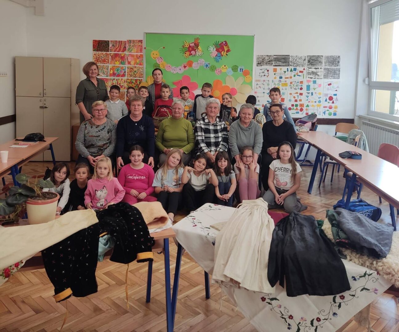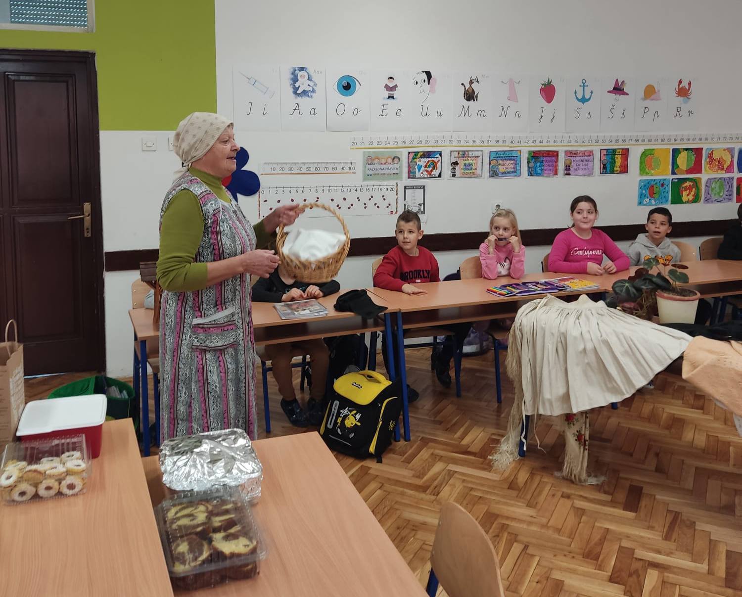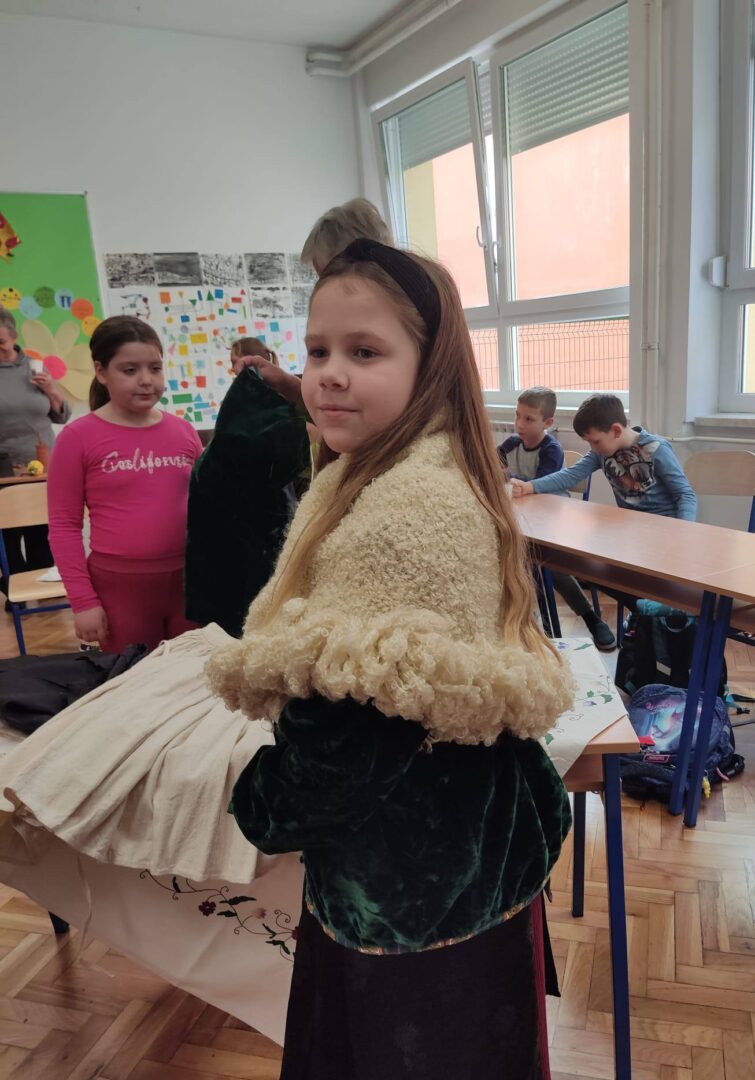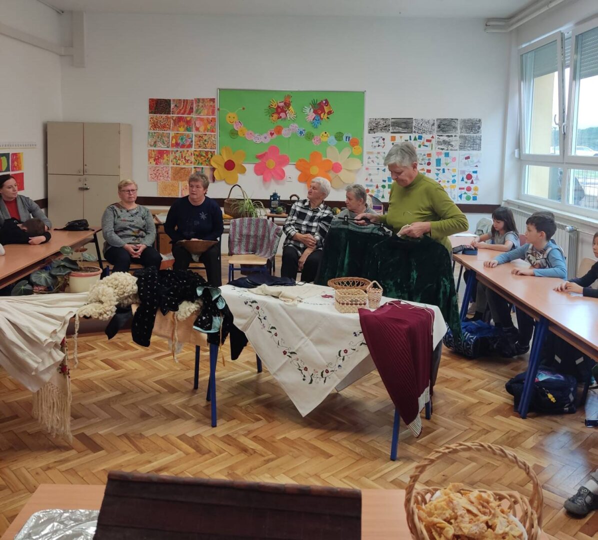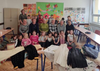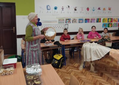 Donijele su sa sobom narodnu nošnju i pričale kako su nekada žene bile obučene za blagdane i radni dan. Obukle su djevojčice u nošnje i svi smo se vratili u neka davna, prekrasna vremena kada je život bio jednostavniji i smireniji. Pričale su nam o svome školovanju i školskim danima. Djeca su im postavljala zanimljiva pitanja na koje su one strpljivo odgovarale. Cijelim razredom širio se miris finih kolača koje su nam donijele i na kojima im zahvaljujemo.